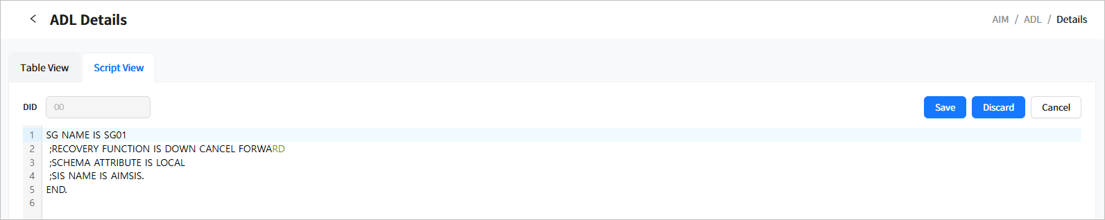 SG 정보를 AIM ADL 스크립트 형태로 조회할 수 있다. 스크립트를 수정한 경우 [Save] 버튼을 클릭하면 수정한 내용이 저장되고, [Discard] 버튼을 클릭하면 수정 전 스크립트로 복원된다.